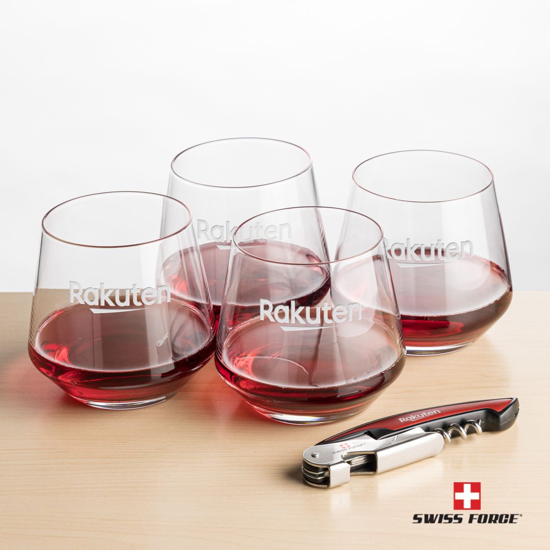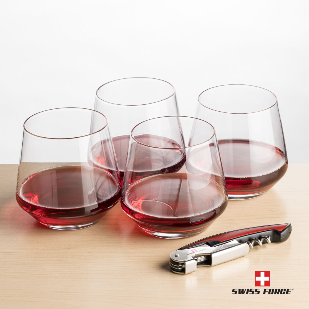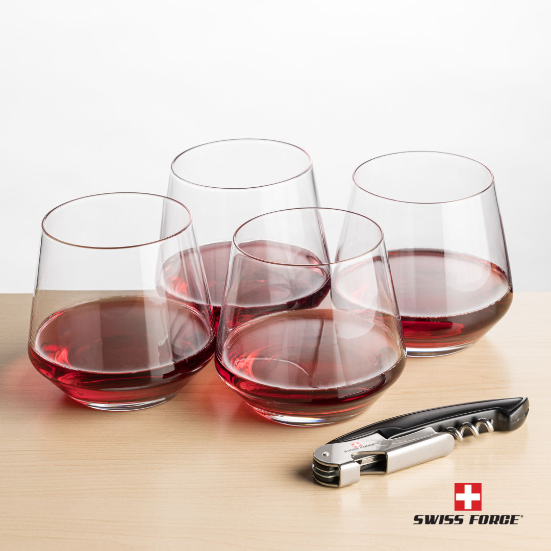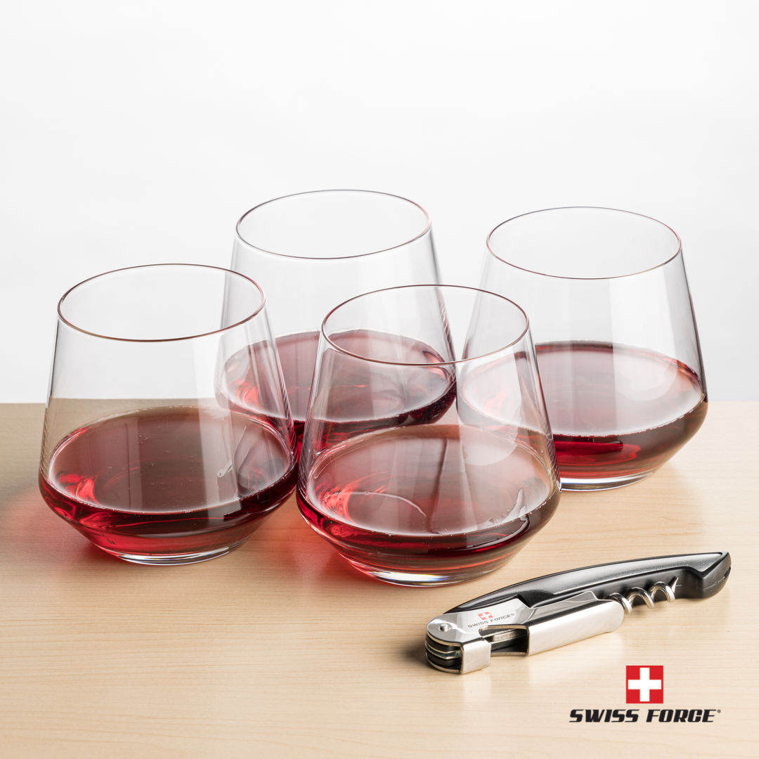 Our Tucson Stemless Wine Glasses and Swiss Force® Impressive Wine Tool work together to provide the best wine-drinking experience. The Swiss Force® Impressive Wine Tool functions include a foil cutter, corkscrew, bottle lever, and opener. Packaged in a satin-lined presentation gift box for an elegant gift set for any occasion.